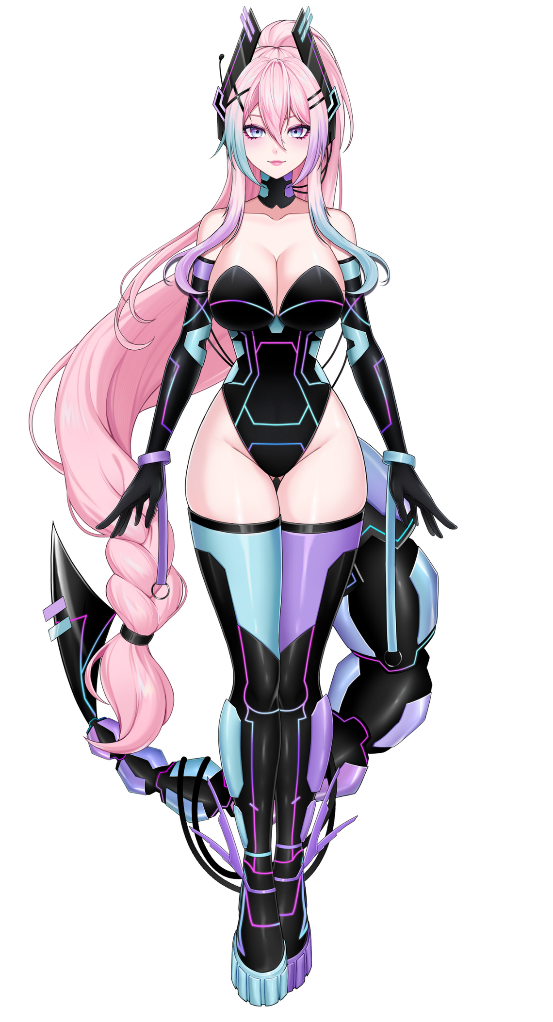 ⟡ Her tail, horns, and katana are all virtually indestructible, despite Lae's attempts to remove it. They cycle through purple/pink/blue lights. She has lightening powers that is sourced from within her, and can channel that electricity into her tail and katana.⟡ Her back tattoo are her "wings". They transform into robotic wings to help her glide. (She has not yet discovered this feature.)⟡ Her hair forms into a braid at the end as an ode to her old hairstyle she loved as a kid. She wears bobby pins on either side of her bangs and dyed her tips purple/blue to heal her inner teen that never was able to be embrace her femininity.